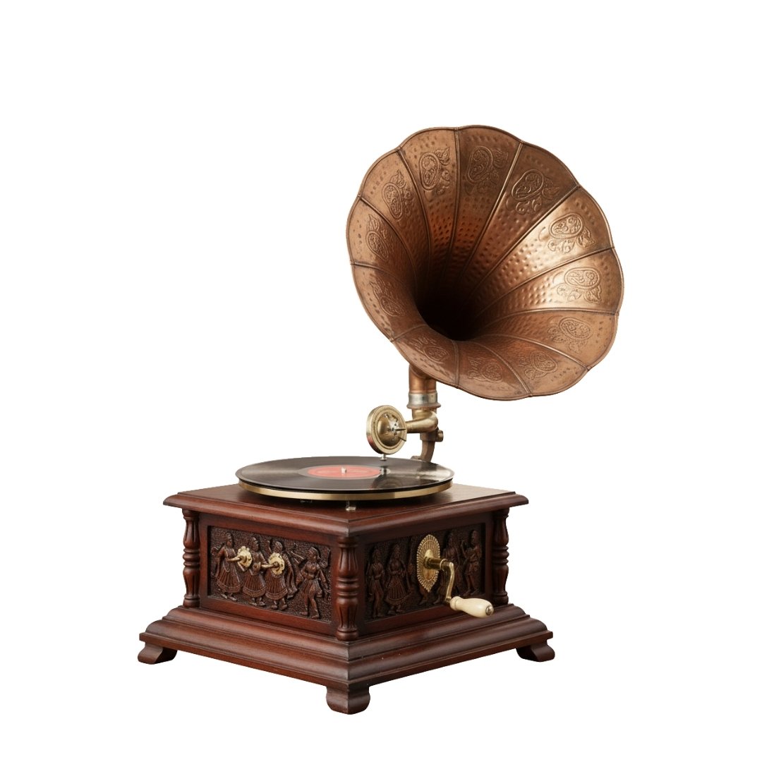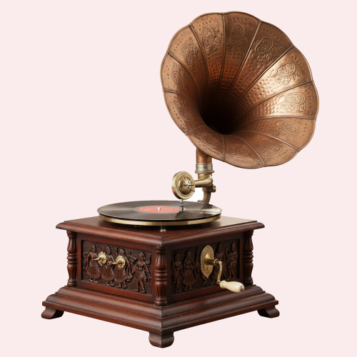 This antique Gramophone is a stunning blend of vintage acoustics and artistry. It features a large, embossed brass horn with intricate floral patterns for natural sound amplification. The wooden base is adorned with hand-carved figures and a classic hand-crank, embodying the sophisticated charm of early 20th-century musical craftsmanship..