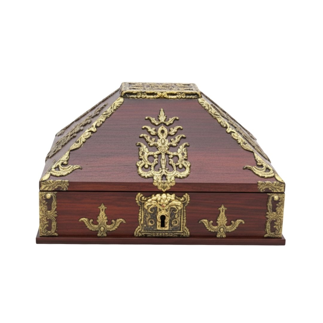 This Aamadai Petti (Traditional Kerala Treasure Box) is a masterpiece of antique craftsmanship, traditionally made from premium wood like teak or rosewood. It features intricate brass metal embossing and floral filigree across its unique sloped lid. These boxes were historically used by royalty to secure jewelry and valuable documents.
