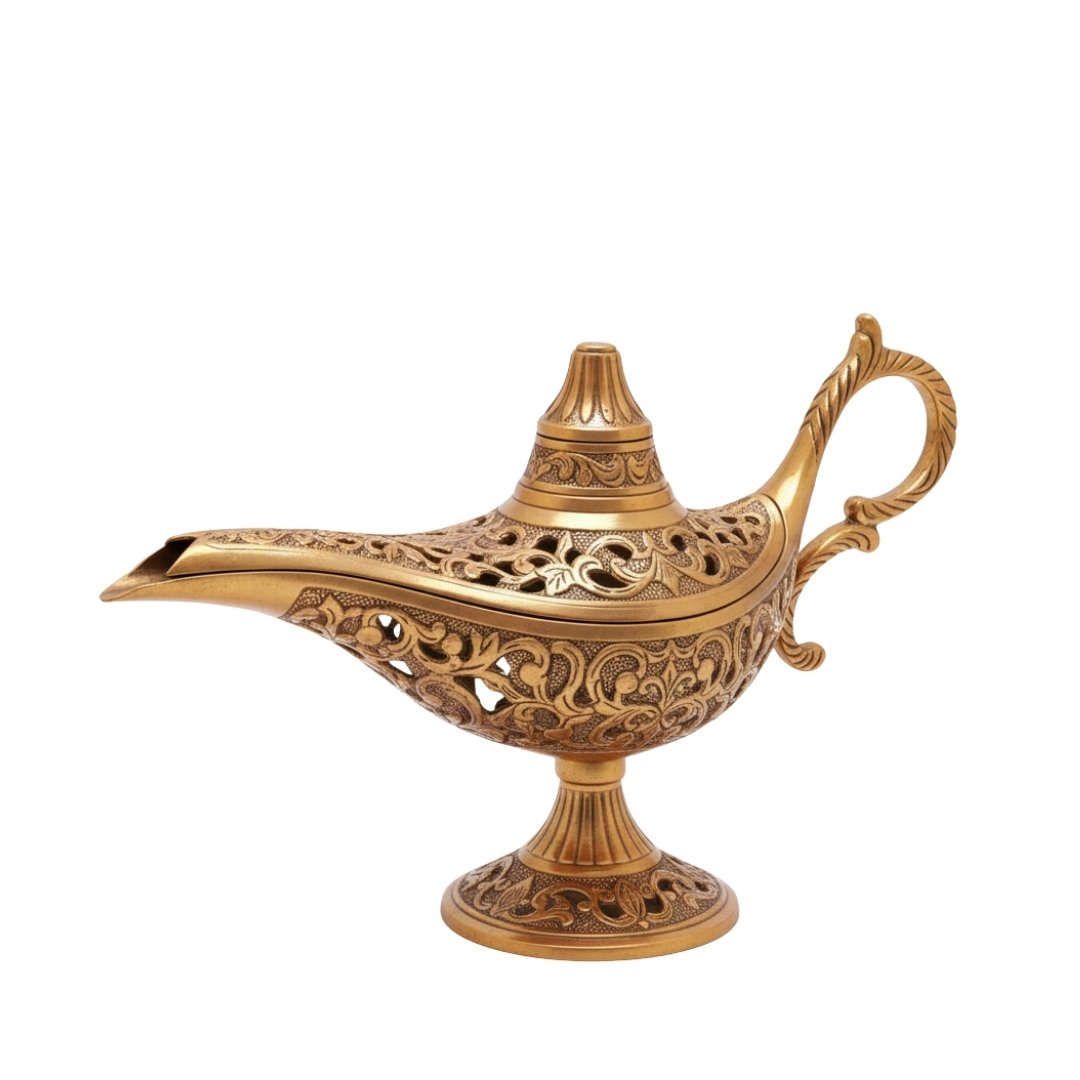This antique Aladdin-style oil lamp is a masterpiece of ornate metalwork, cast in a rich golden brass finish. It features intricate open-work filigree and floral engravings across the body and base. The elegant curved handle and slender spout evoke the mystical charm of ancient Middle Eastern folklore and traditional artistry.
