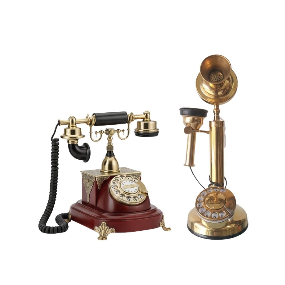These antique candlestick and cradle-style telephones represent the pinnacle of early 20th-century communication. Crafted from polished brass and wood, they feature a classic rotary dial and a separate earpiece. These vintage pieces reflect a bygone era of elegance, combining functional engineering with sophisticated decorative artistry.