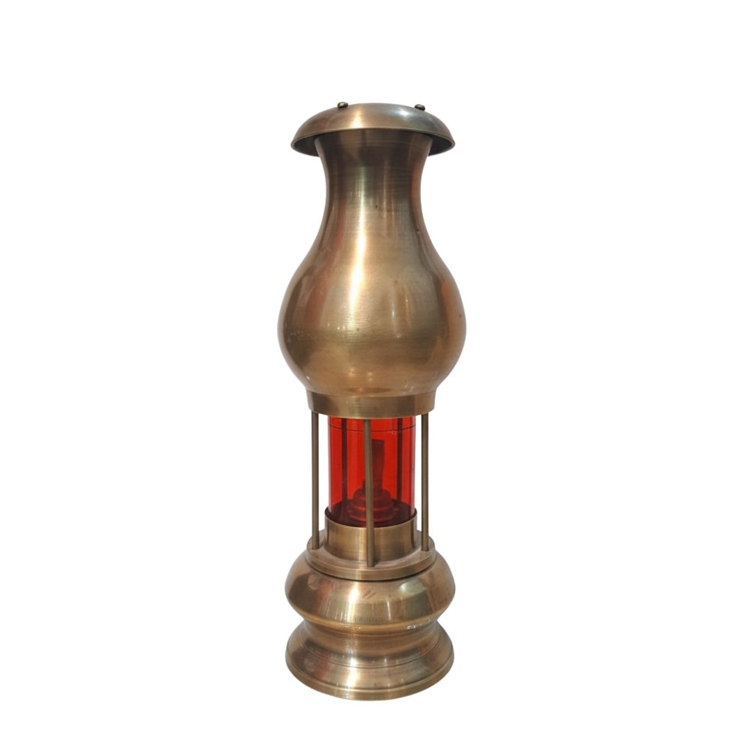 This antique brass nautical oil lamp features a vintage weathered patina, reflecting its maritime history. Its central chamber is encased in a protective red glass lens, designed to signal at sea. The stout, tiered base and domed top showcase classic 19th-century craftsmanship, making it a timeless collector’s centerpiece.